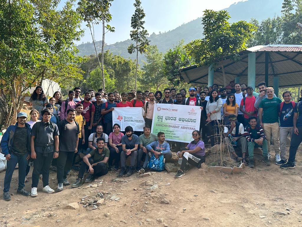 Pranav Foundation is making significant strides in its environmental projects, with a focus on initiatives such as plantation drives and the Swachh Bharat Abhiyan. One of their recent endeavors involved organizing a Swachh Bharat Abhiyan at Skandagiri Trekking Hills in Chikkaballapura District, in collaboration with Youth For Seva and Texas Instruments Bangalore. This joint effort saw volunteers from all three organizations come together to clean the hill, starting from its base to the summit, as well as the surrounding areas like parking lots and pathways leading to the trek’s starting point.